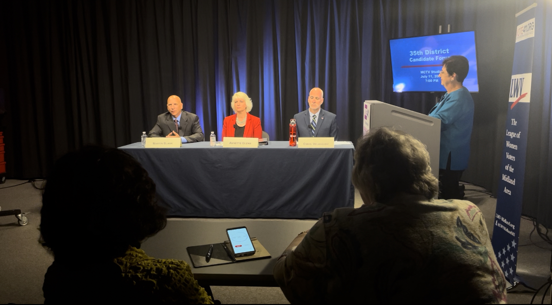 About 25 attendees watched the broadcast at the MCTV Studio, which is located in the lower level of the Grace A. Dow Memorial Library. The event series will be rebroadcast throughout local TV channels and YouTube. Questions to candidates were developed by the League of Women Voters. Participants had two minutes to respond, with one minute later allotted for a reply.