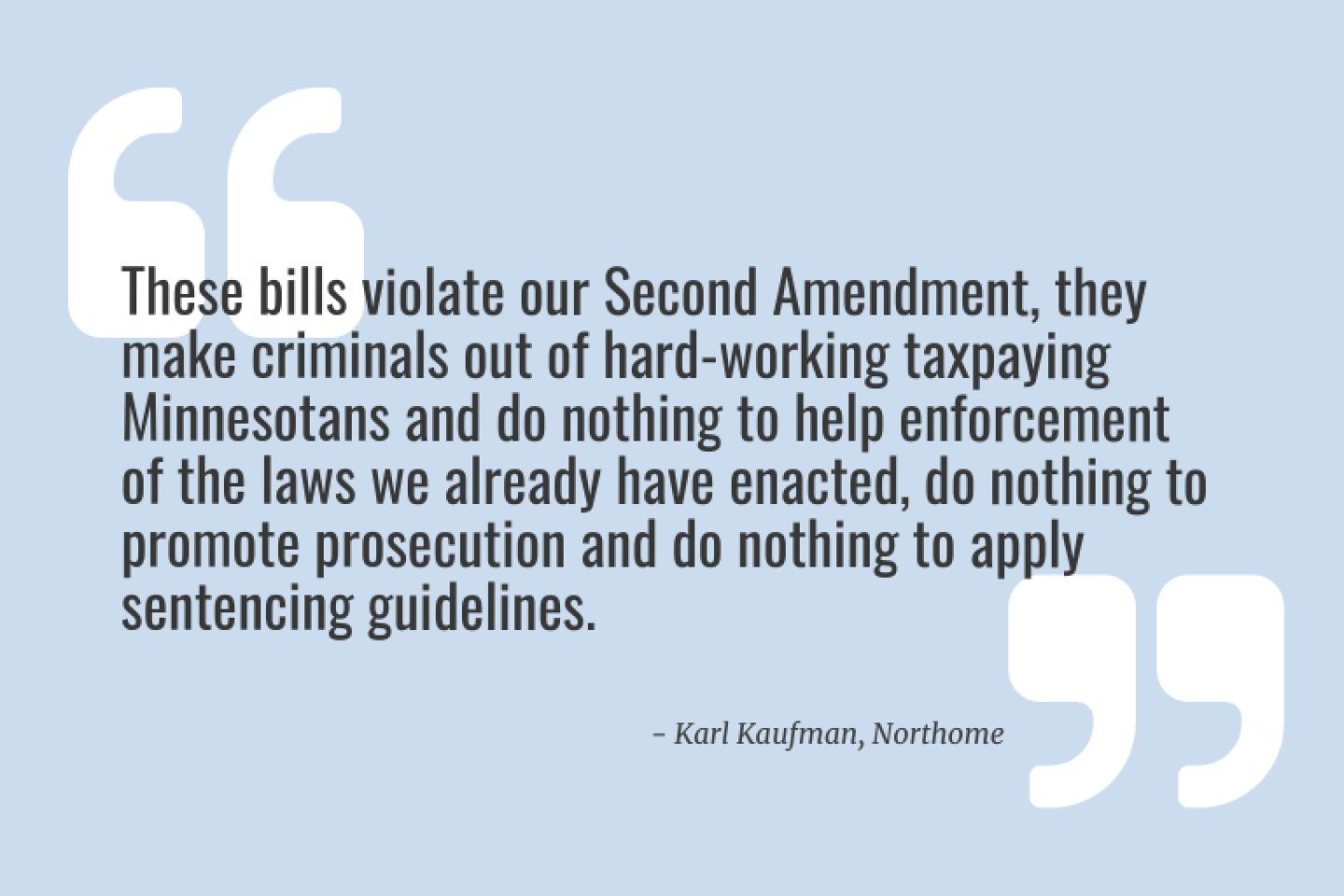 These bills violate our Second Amendment, they make criminals out of hard-working taxpaying Minnesotans and do nothing to help enforcement of the laws we already have enacted, do nothing to promote prosecution and do nothing to apply sentencing guidelines.