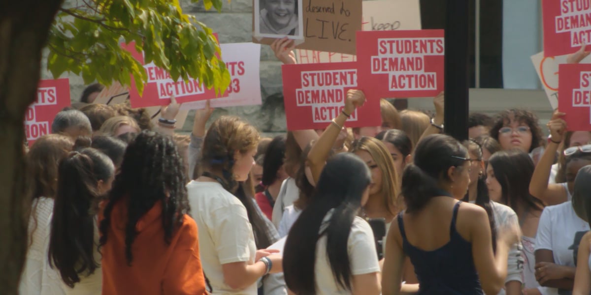 Dozens of students walked out of class on Friday, September 5, carrying signs and wearing shirts that read “students demand action.”